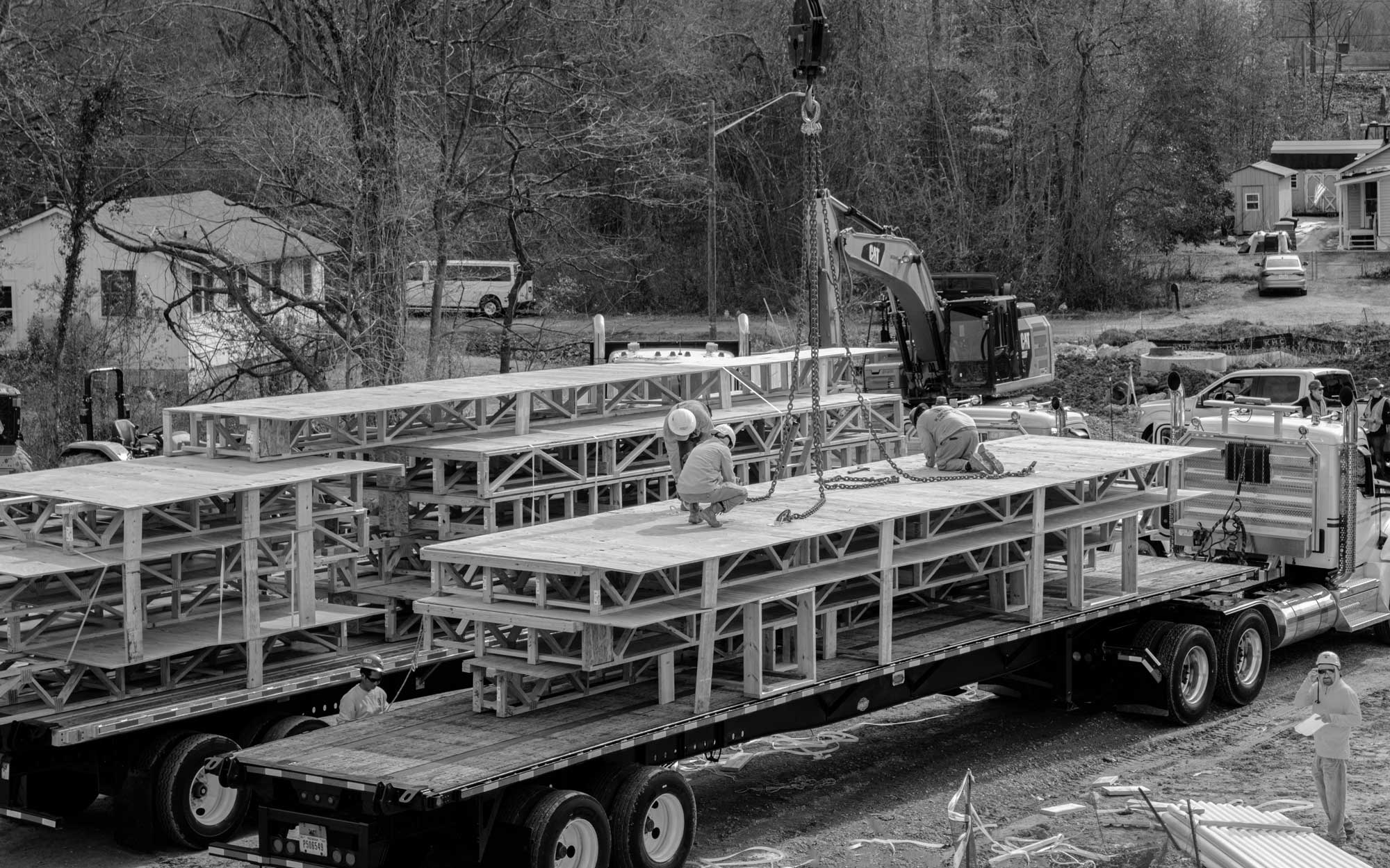 Prefabricated wall panels deliver structural consistency and reduce onsite framing time. Panelized construction engineered to your plans, ready to stand on arrival.